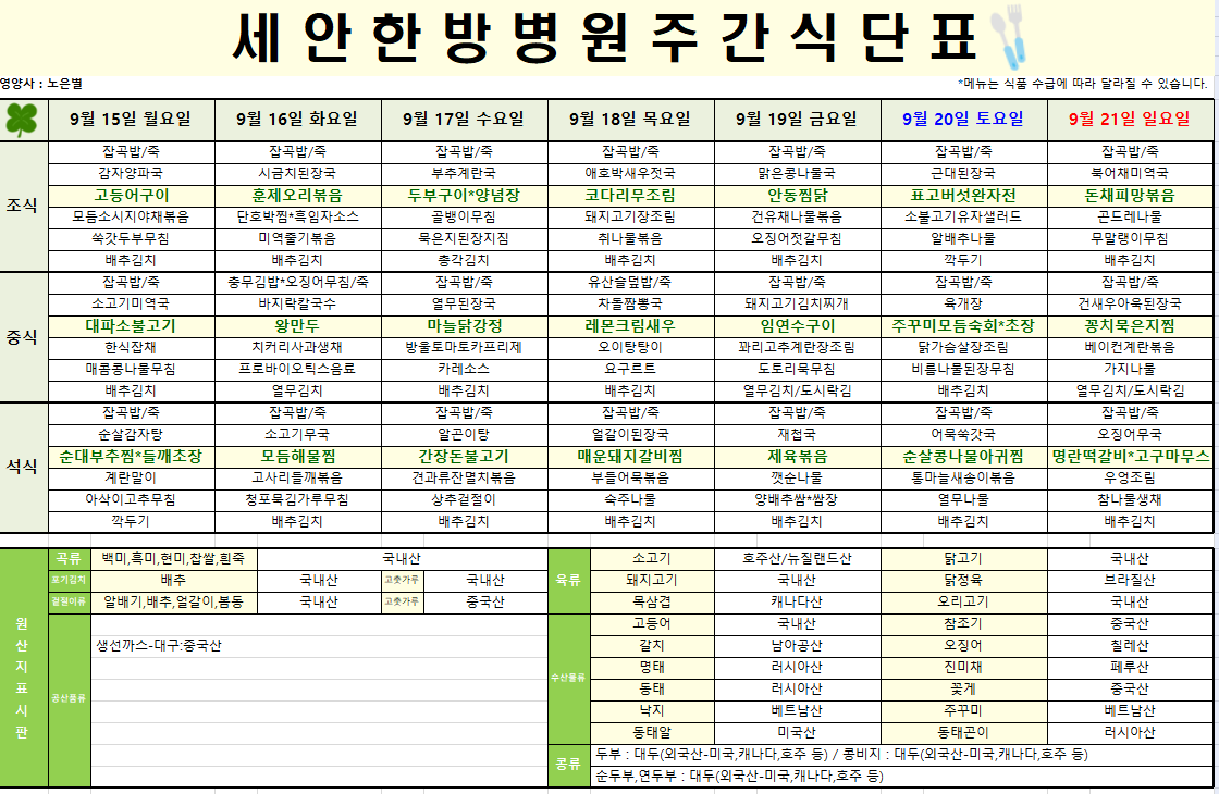 2025.09.22~2025.09.28 식단표 입니다~^^