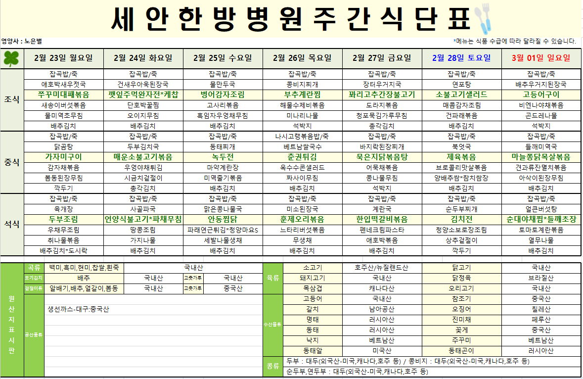 2026.02.23~2026.03.01 식단표입니다~^^